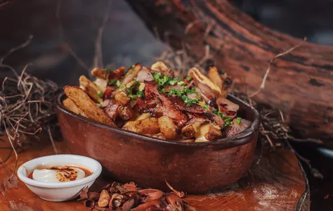 Papas fritas caseras acompañadas de cebolla caramelizada, huevo frito, queso mantecoso con un mix de longanizas y salchichas modinger acompañado de cerdo y pollo salteado.