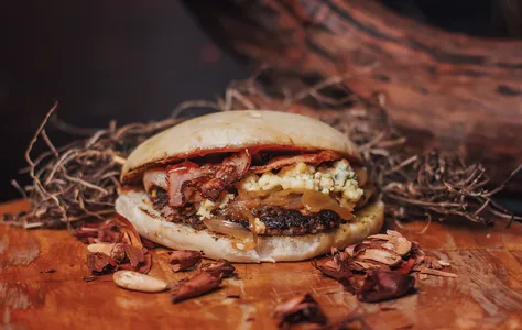 Queso Azul, Tocino y Cebolla Caramelizada con Salsa BBQ.
