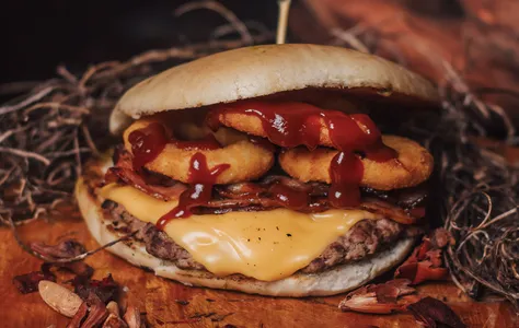 Queso Cheddar, Tocino, Aros de Cebolla y Salsa BBQ.